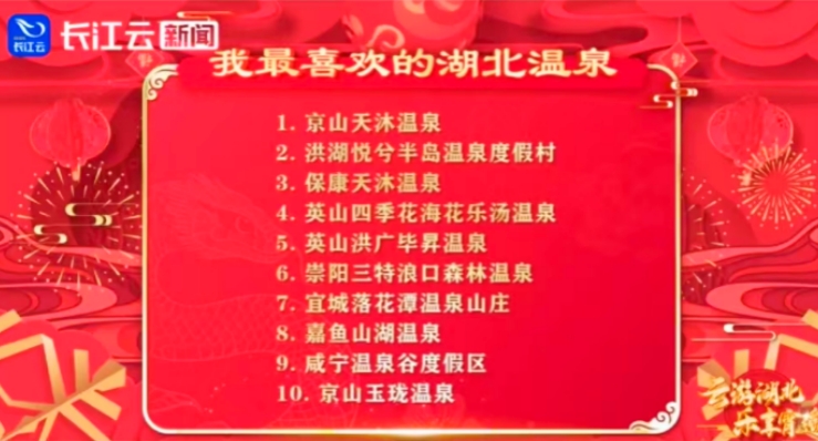 (英山花海情园旅游度假区讯) 2月12日,在长江云新闻直播2025年“云游湖北·乐享宵遥”元宵节晚会上,公布了“我最喜欢的湖北温泉”票选结果,经社会各界网络投票,英山四季花海花乐汤温泉等10家温泉榜上有名。